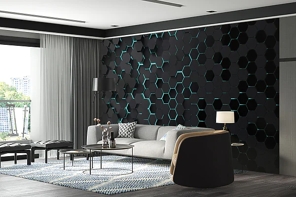 | Abstraktní 3D Hexagon | Opticky rozšiřuje prostor, univerzální design | Moderní, svěží vzhled |