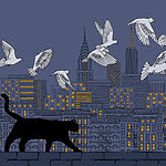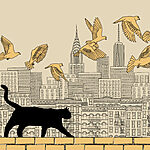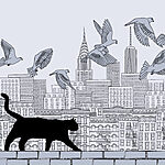 Fototapeta Kočka kráčející po zdi s ptáky létajícími na obloze