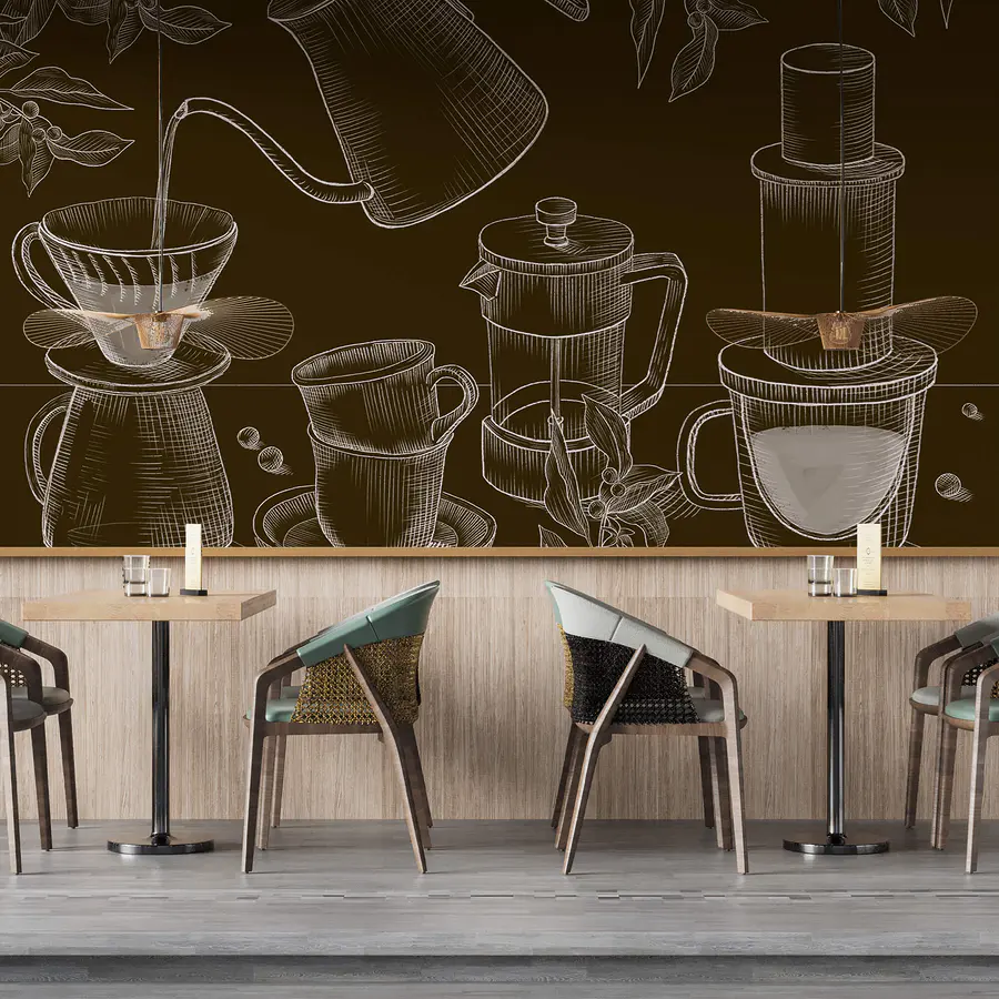 Proměňte svůj prostor pomocí této jedinečné nástěnné malby s elegantní ilustrací kávovarů a konvic, která jistě oživí vaše stěny. Představte si, jak při pohledu na toto okouzlující umělecké dílo popíjíte čerstvý nápoj - možná vás to inspiruje k vytvoření vlastního mistrovského díla s kávou. Syté zemité tóny vytvářejí útulnou atmosféru, která je ideální pro líná rána nebo kreativní odpoledne. Je to jako mít doma mini kavárnu. Navíc je to skvělý začátek konverzace pro přátele, kteří ocení umění i šálek dobrého kafe! Vneste do svého domova toto teplo a kreativitu s touto nádhernou nástěnnou malbou.