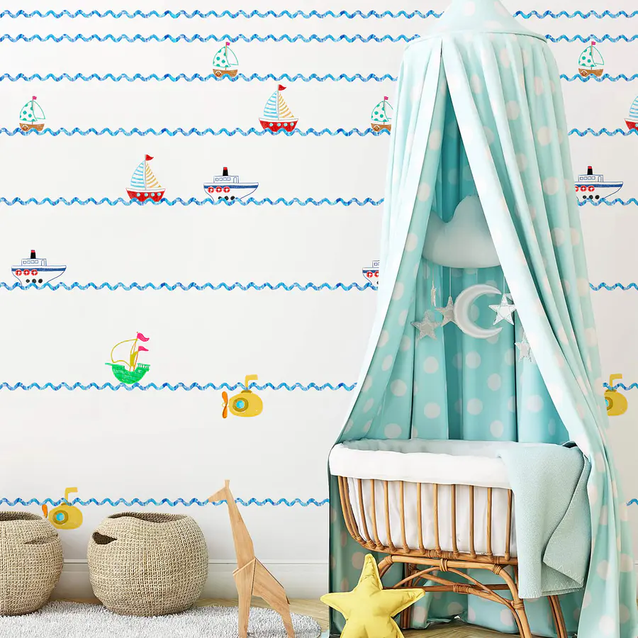 Proměňte dětský pokoj v mořské dobrodružství s touto hravou nástěnnou malbou s loděmi a ponorkami! Představte si to vzrušení, když děti pozorují barevné plachetnice tančící na jemných vlnách. Každá loď jako by lákala k novému příběhu nebo snění o mořských dobrodružstvích – pirátských pokladech, podmořských zázrakech nebo jen plavání s občerstvením v ruce. Nejde jen o dekoraci; podněcuje představivost a vytváří příjemnou atmosféru, díky které je hraní ještě zábavnější. Ideální pro námořní téma nebo jako jasný prvek, který udržuje ducha oceánu naživu i v interiéru. Kdo by nechtěl každou noc odplout do říše snů?
