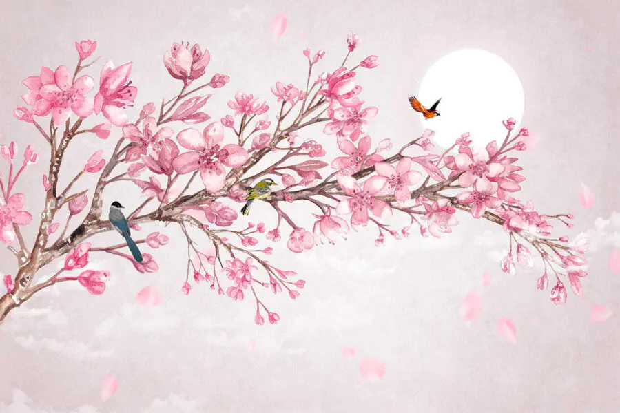 Fototapeta Malba větve s růžovými květy a ptáky