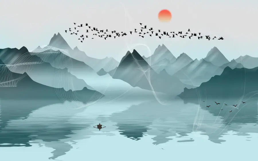 Fototapeta Skupina ptáků letících nad jezerem