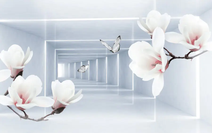 Fototapeta Bílé květiny a motýli v místnosti
