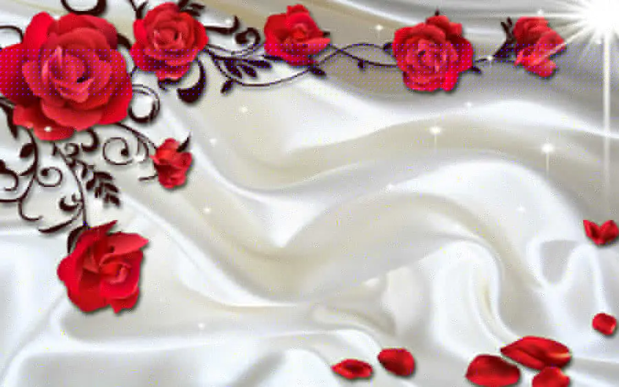 Fototapeta Bílý satén s červenými růžemi a okvětními lístky