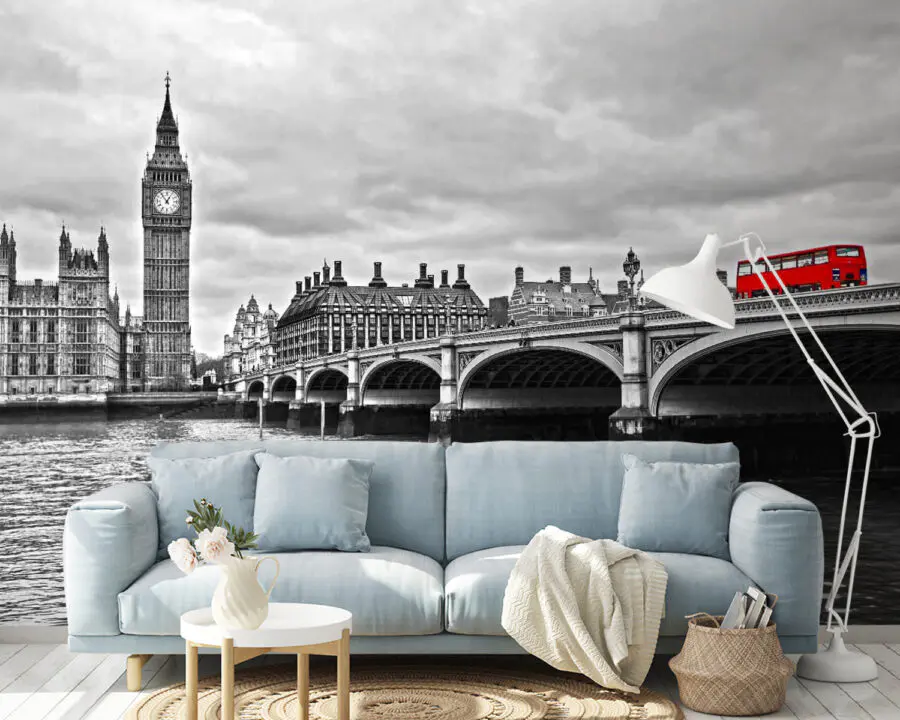 Fototapeta Most přes vodu s hodinovou věží a červeným autobusem