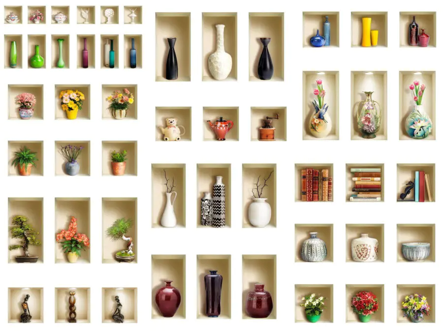 Fototapeta Stěna s policemi plnými váz a květin
