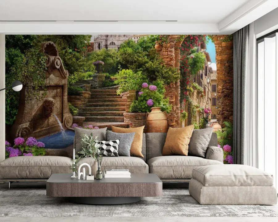 Fototapeta Kamenná cesta s fontánou, schody a květinami