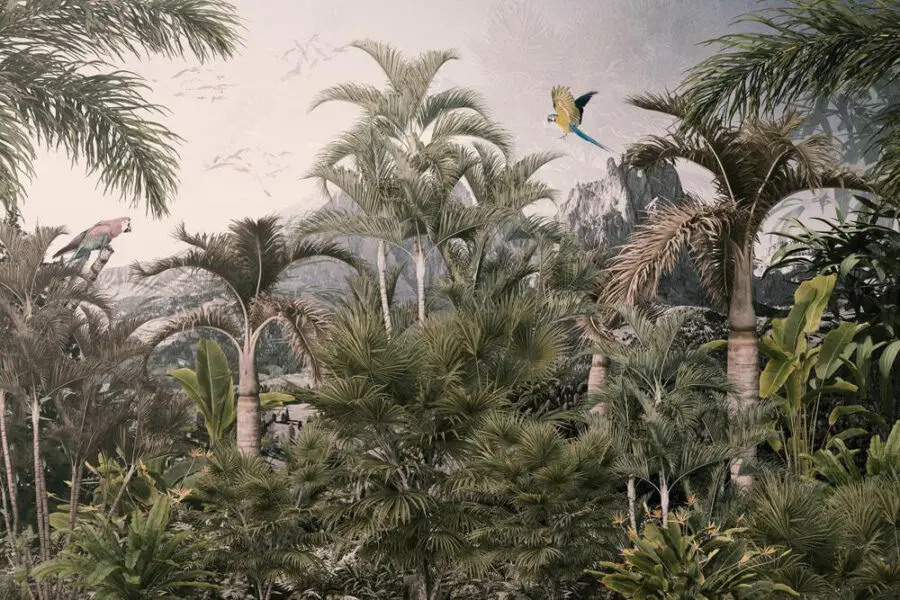 Fototapeta Tropický les s palmami a letícím ptákem