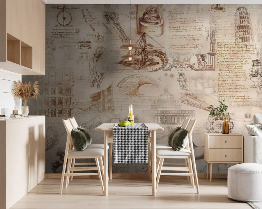 Proměňte jakoukoli stěnu v místo, kde se bude povídat, pomocí této úžasné nástěnné malby s historickými ilustracemi a náčrtky. Představte si, že vstoupíte do světa, kde se střetává umění a historie. Od velkoleposti starověké architektury až po rozmarné vynálezy - je toho tolik, co můžete objevit. Je to jako mít knihovnu plnou dobrodružství přímo na zdi! Přátelé se budou ztrácet ve složitých detailech a zároveň sdílet příběhy a chichotání u kávy. Tato nástěnná malba nejenže vnese do prostoru charakter, ale také dodá dávku zvědavosti, která udržuje fantazii naživu. Vytvořte si útulné zákoutí nebo odvážnou výraznou stěnu - v obou případech určitě vyvolá radost a inspiraci.