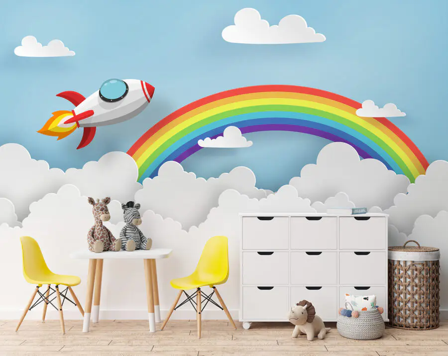 Fototapeta Raketa letící na obloze s mraky a duhou