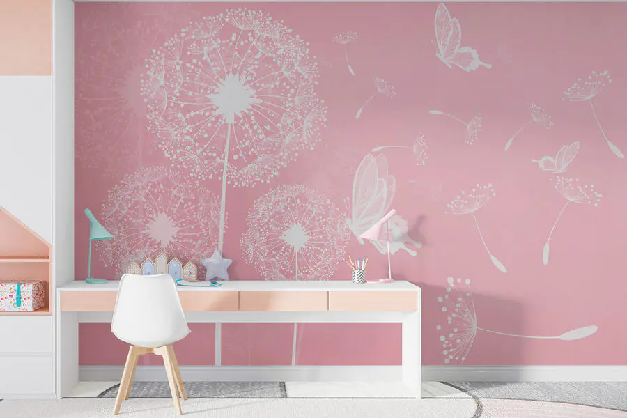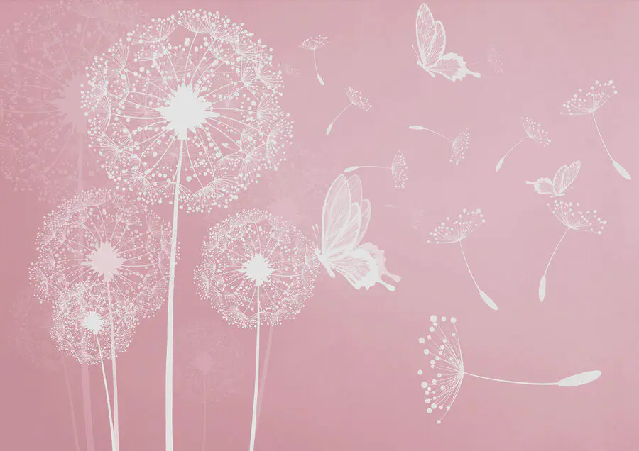 Fototapeta Růžové pozadí s bílými pampeliškami a motýly