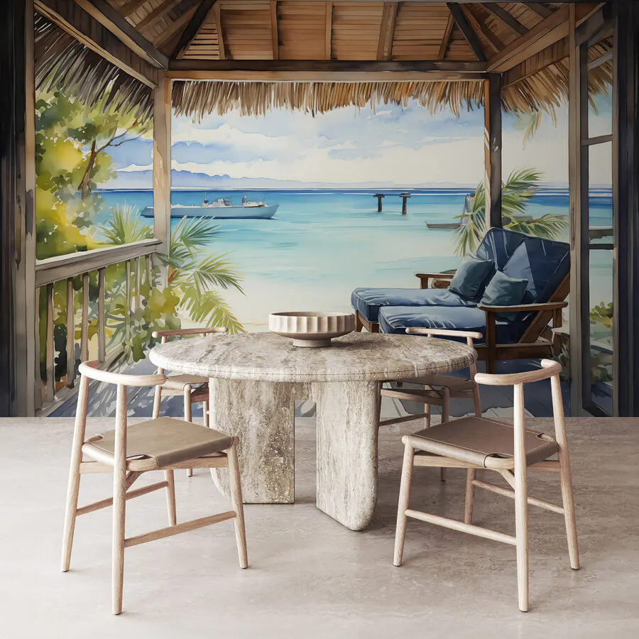 Fototapeta Akvarelová malba pláže s židlemi a člunem