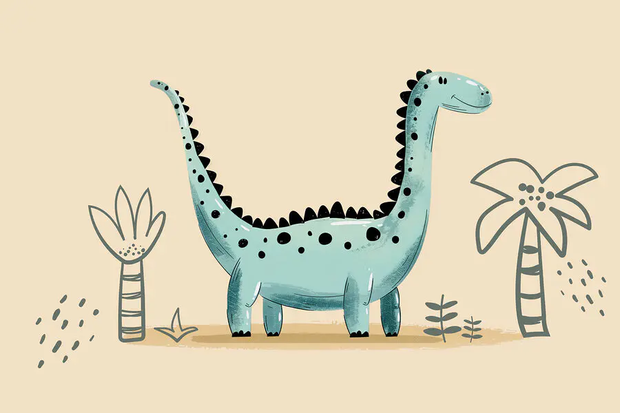 Fototapeta Kreslený dinosaurus s rostlinami a listy