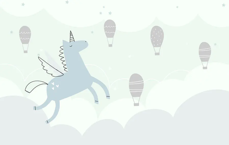 Fototapeta Modrý jednorožec s křídly a křídly létající na obloze s horkovzdušnými balóny