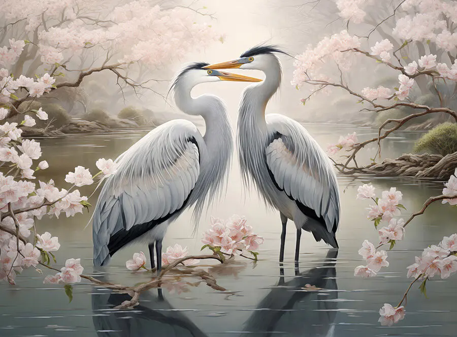 Fototapeta Pár bílých ptáků stojících ve vodě s růžovými květy