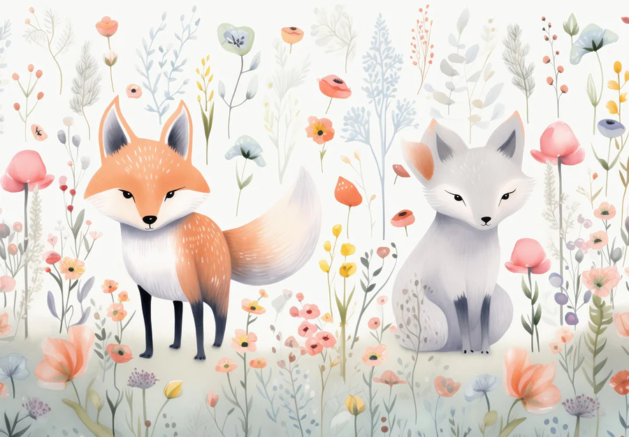 Fototapeta Pár lišek v květinové zahradě