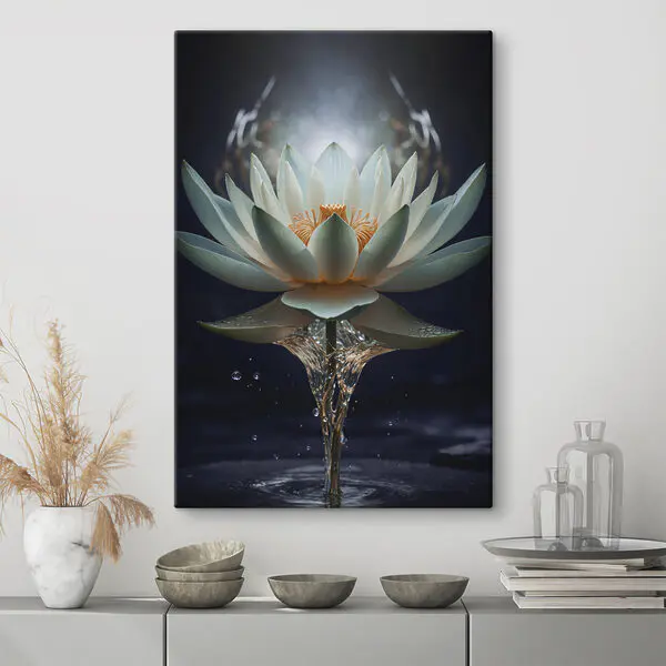 Obraz Bílý květ se žlutým středem a stříkající vodou