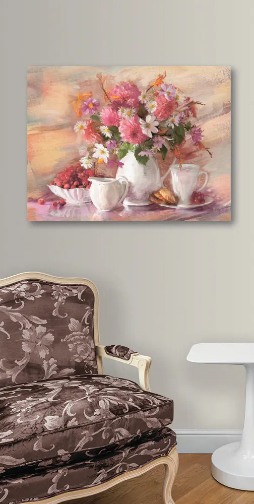 Obraz Obraz s květinami ve váze a miskou s jídlem