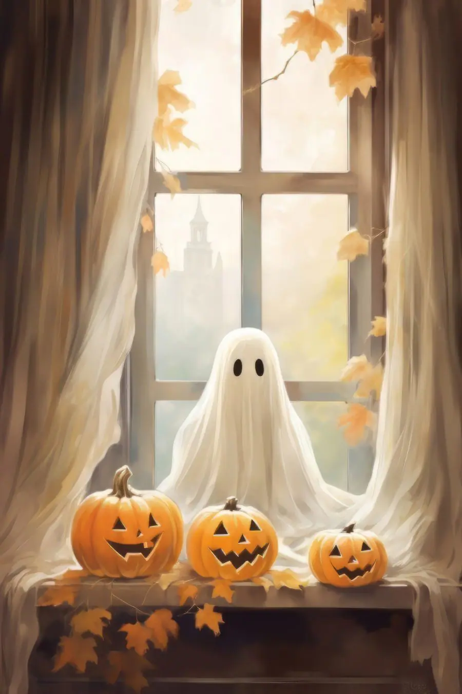 Obraz Skupina dýní a duch sedící na okenním parapetu
