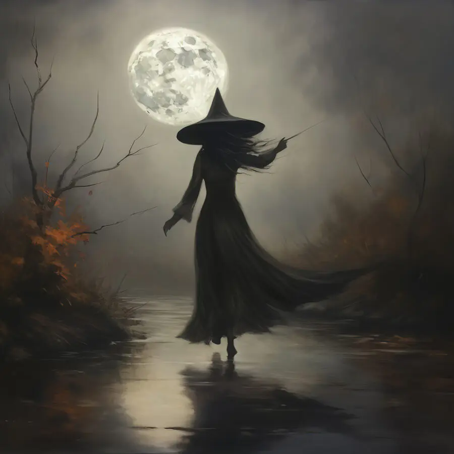 Obraz Žena v osobním oděvu kráčející po cestě s měsícem v úplňku