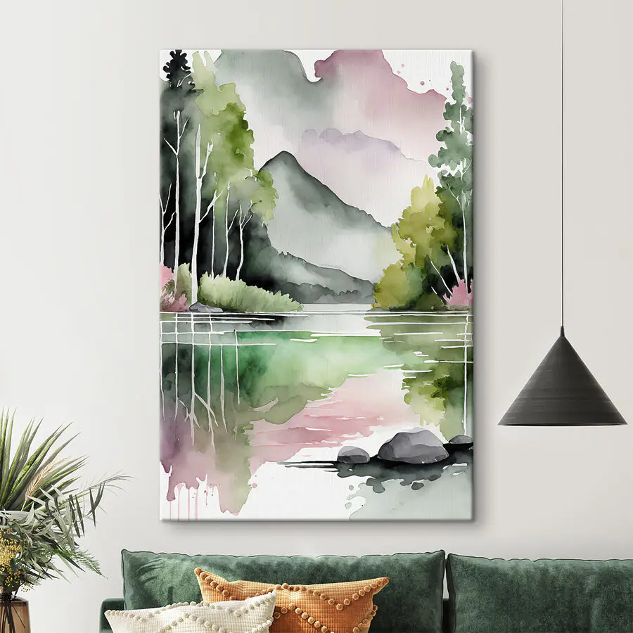 Představte si, že vejdete do svého pokoje a okamžitě pocítíte vlnu klidu a pohody. Přesně to získáte s tímto úžasným akvarelovým plátnem s potiskem jezera orámovaného stromy a s majestátními horami v pozadí. Je to jako rychlý útěk do přírody - bez spreje proti hmyzu! Jemná zelená, růžová a zemité tóny mu dodávají snový, ale zároveň živý vzhled, který je ideální pro doplnění jakéhokoli prostoru inspirovaného přírodou. Je to jeden z těch kousků, které vás donutí zhluboka se nadechnout a možná i podržet ranní kávu o něco déle, abyste si to všechno mohli vychutnat. Přemýšlejte o jeho umístění na místo, kde ho uvidíte hned ráno - krásný způsob, jak začít den. Ideální pro milovníky přírody, nadšence do umění nebo kohokoli, kdo potřebuje ve svém životě trochu zenu. Navíc je velmi univerzální. Ať už si jím ozvláštníte obývací pokoj, ložnici, nebo dokonce chodbu, hodí se sem. Upřímně řečeno, je to jako mít na zdi pověšený kousek klidu přírody - aniž byste se museli sbalit a vyrazit kempovat. Hřejivý, příjemný a tak uvolňující.