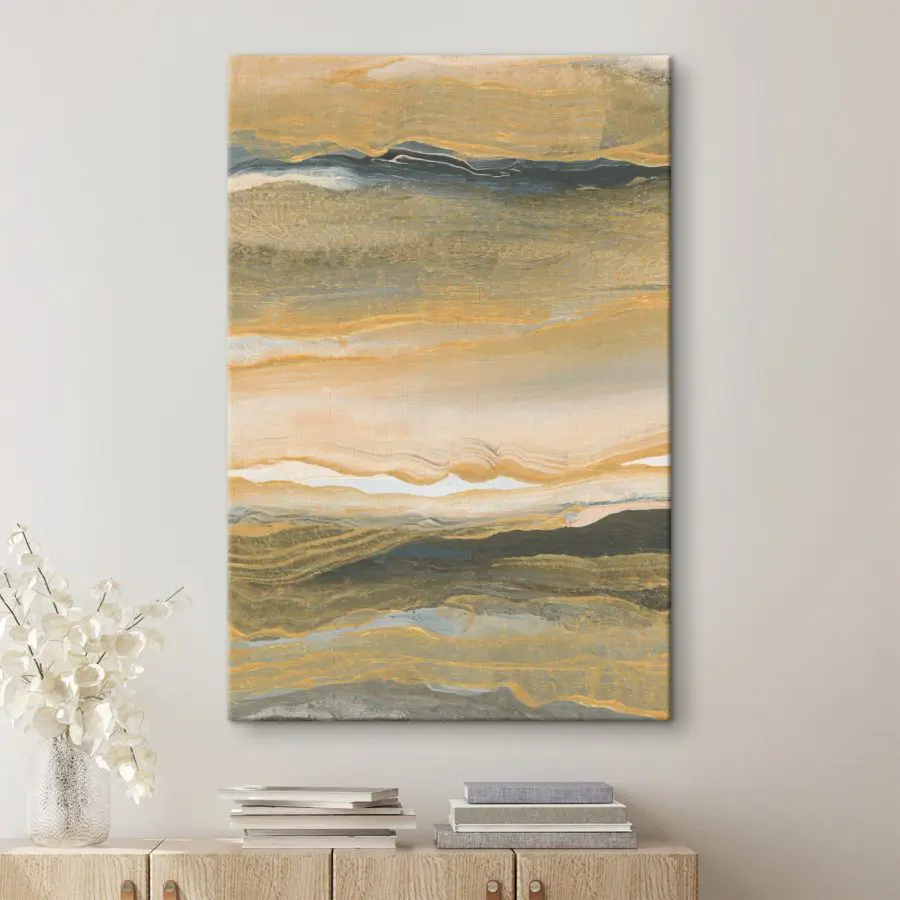 Představte si, že se uvelebíte ve svém oblíbeném křesle, v ruce držíte šálek horkého čaje a díváte se na "Rozsáhlé vrstvy zemského umění" na zdi. Jako by matka příroda vypila příliš mnoho espressa a rozhodla se namalovat své sny. Toto umělecké plátno není jen kus - je to portál. Tyto víry a zemité odstíny vás zvou na cestu časem a prostorem a nabízejí klidné krajiny, aniž byste museli opustit svůj gauč. Ideální pro starou duši se zálibou v dobrodružství - nebo prostě pro někoho, kdo ocení dobré zdřímnutí na plátně.