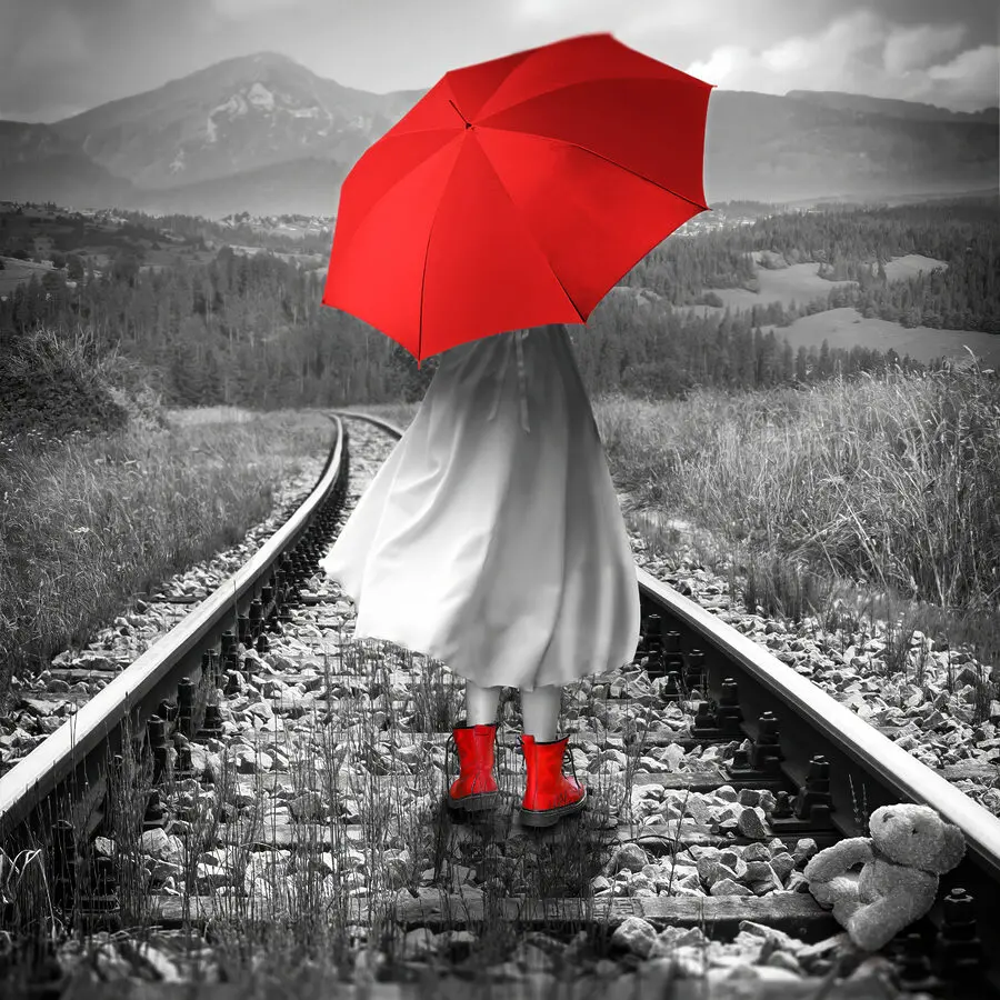 Seznamte se s tímto úchvatným potiskem na plátně, na němž na černobílém pozadí vyniká nápadný červený deštník. Představte si pocit, jako byste stáli u starých vlakových kolejí a jemný vánek vám šeptal příběhy o dobrodružství. Nečekaný barevný nádech vás vtáhne dovnitř a vyvolá ve vás zvědavost na osobu ve splývavých šatech - na koho asi čeká? Anebo jde spíš o to, najít si vlastní chvilku klidu uprostřed životního chaosu. Skvěle se bude vyjímat v útulném zákoutí nebo jako odvážný výrazný kousek v obývacím pokoji. Rozkošné snění zachycené v umění, které vybízí k novým rozhovorům a možná i k jednomu či dvěma úsměvům.
