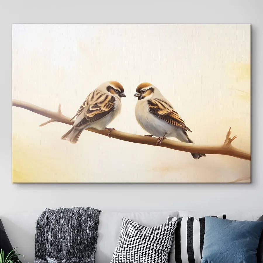 Vneste do interiéru dotek přírody s tímto okouzlujícím potiskem na plátně se dvěma ptáky sedícími na větvi. Je to dokonalý kousek, který našeptává klid a možná v vás vyvolá snění o klidných ránech mezi štěbetajícími přáteli. Představte si, že toto krásné umělecké dílo rozzáří útulný kout nebo dokonce živý obývací pokoj. Měkké odstíny jsou jako hřejivé objetí pro vaše stěny a vybízejí hosty, aby se u vás zdrželi o něco déle. Ať už jde o zahájení konverzace, nebo jen o pokochání se výhledem, díky tomuto tisku se každý prostor bude cítit o něco výjimečněji - protože kdo by neměl rád opeřeného přítele nebo dva?