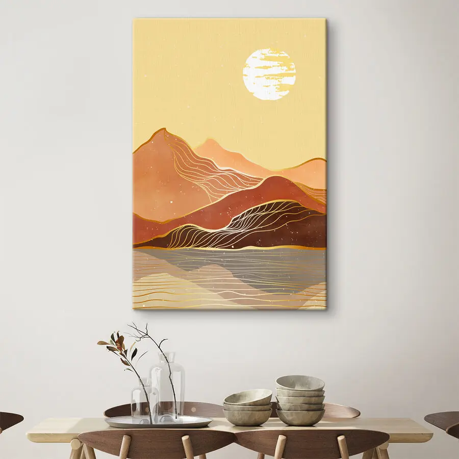 Proměňte jakýkoli prostor s tímto úžasným potiskem na plátně s horským masivem v teplých zlatavých odstínech - je to jako úchvatné západy slunce, ale bez nutnosti nosit turistické boty. Představte si tuto krásu zavěšenou ve vašem obývacím pokoji nebo útulné ložnici, která do vás vnese pocit klidu a dobrodružství. Jemné linie vinoucí se napříč horami dodávají nádech rozmarnosti a lákají k prozkoumání každého centimetru. Není to jen umění, je to atmosféra. Ideální pro dny, kdy chcete snít o vzdálených místech přímo z gauče. Kdo ví? Třeba vás inspiruje k dalšímu dobrodružství!