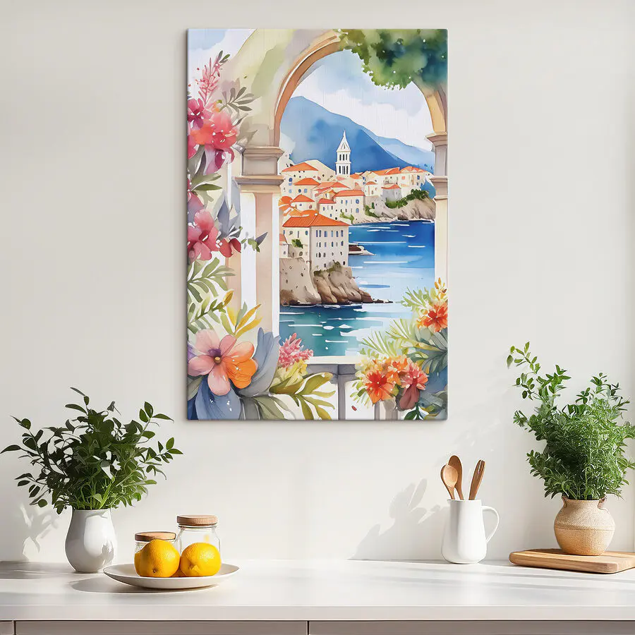 708.52 Kč389.68 KčObraz Obraz města na pláži s loděmi a květinami