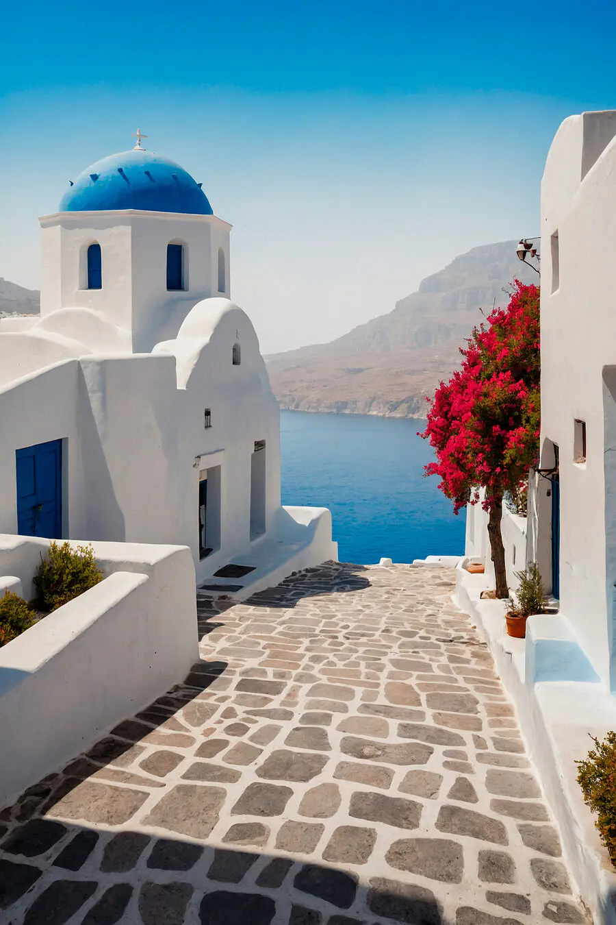 Obraz Bílé budovy s modrou kopulí a modrou střechou