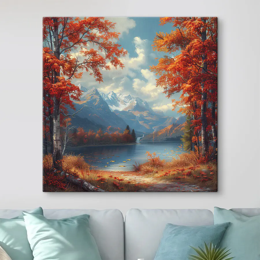 Obraz Jezero s oranžovými listy a horami v pozadí