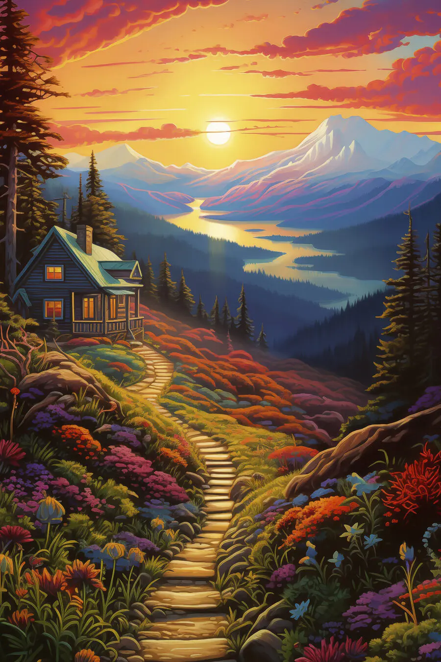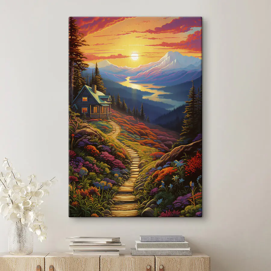 Obraz Dům na kopci s cestou vedoucí do údolí s horami a řekou