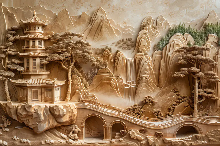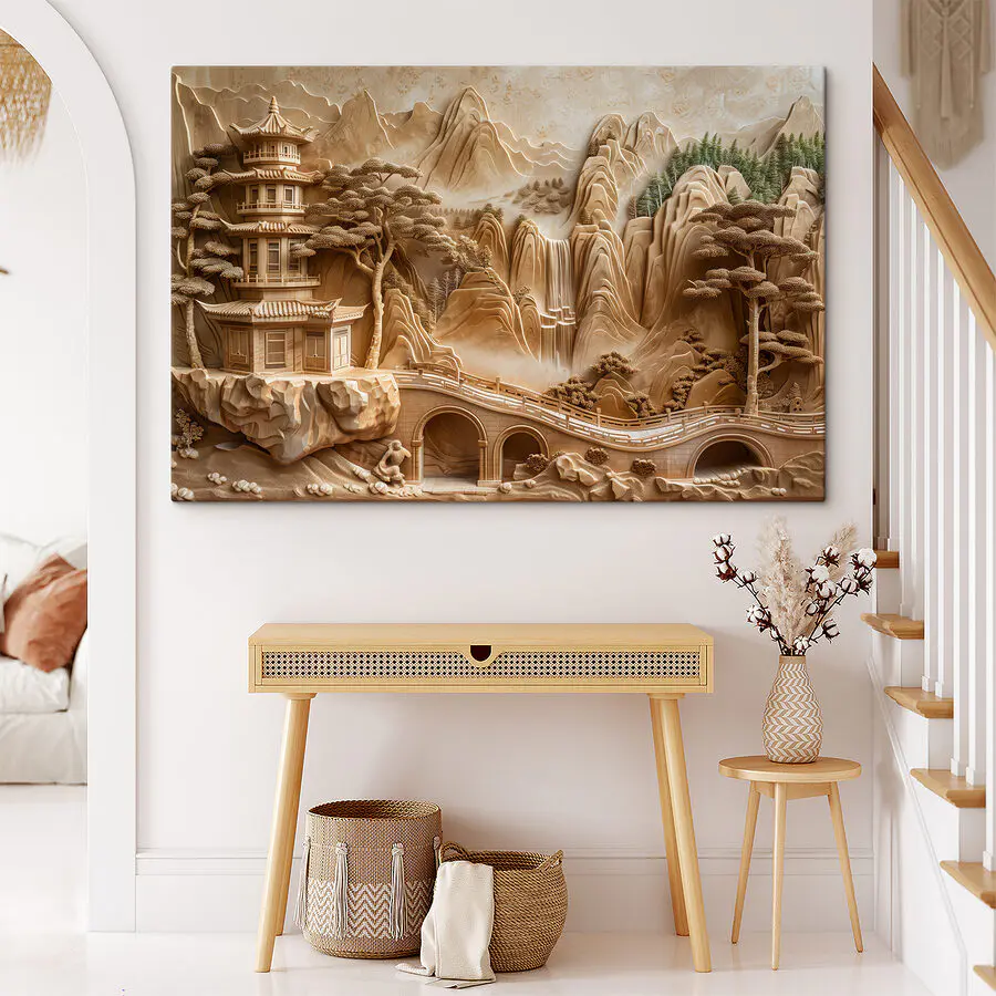 Představte si, že vstoupíte do klidného světa, kde vládne pohoda. Tento tisk na plátno zachycuje podstatu složité sochy, v níž se prolíná majestátní most s okouzlující budovou zasazenou do japonské krajiny. Působí jako něžná náruč pro váš pokoj a vybízí vás, abyste každý den unikli do jeho klidného kouzla. Ideální pro každého, kdo touží po doteku přírody v interiéru. Vrstvy detailů vás vtáhnou dovnitř - je to kousek, který šeptá poklidná dobrodružství pokaždé, když se na něj podíváte.