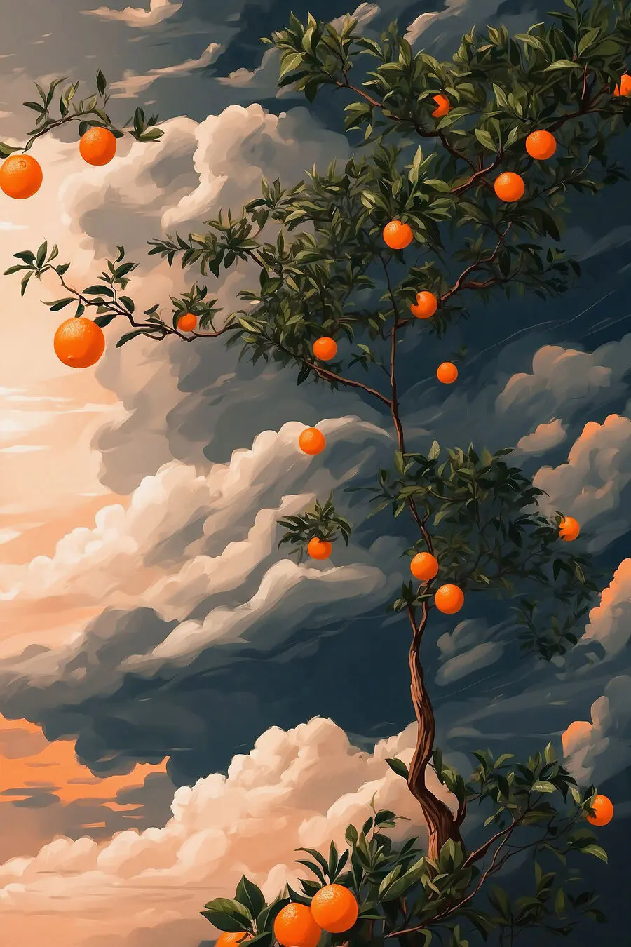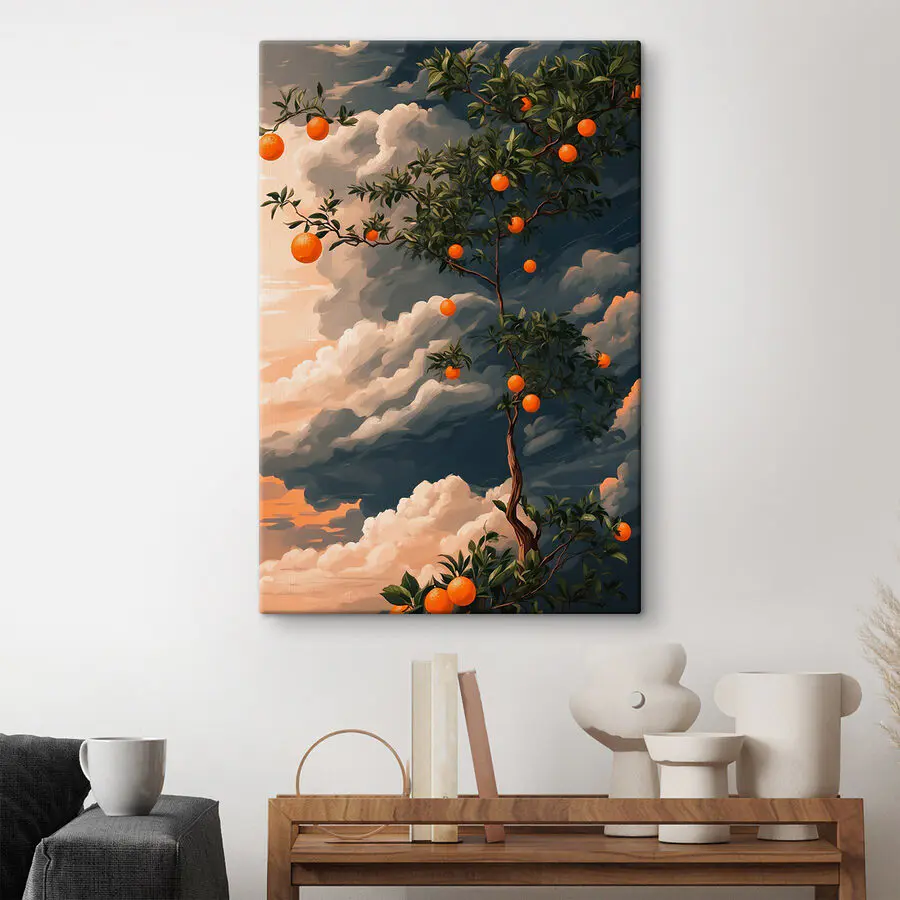Představte si strom tančící zářivými pomeranči na pozadí dramatické oblohy - toto plátno je čirým potěšením! Ideální pro ty, kteří si potrpí na rozmar a dotek přírody ve svém interiéru. Ucítíte, jak do vašeho prostoru proniká teplo, když jasný pop citrusových plodů zvedne náladu a zahájí konverzaci. Je to jako mít slunečný koutek ovocného sadu přímo na zdi. Ideální pro kuchyně toužící po osobitosti nebo obývací pokoje, které potřebují chuť do života. S každým pohledem nechte dozrát fantazii. Neodolatelné, že?