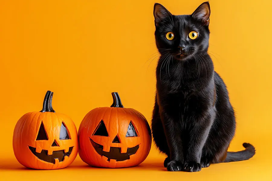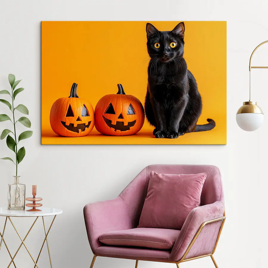 Obraz Černá kočka sedící vedle dvou vyřezávaných dýní
