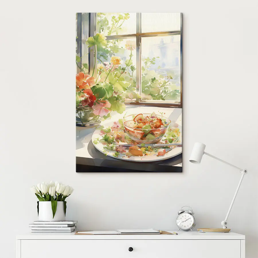 Obraz Akvarelová malba mísy s jídlem a květinami před oknem