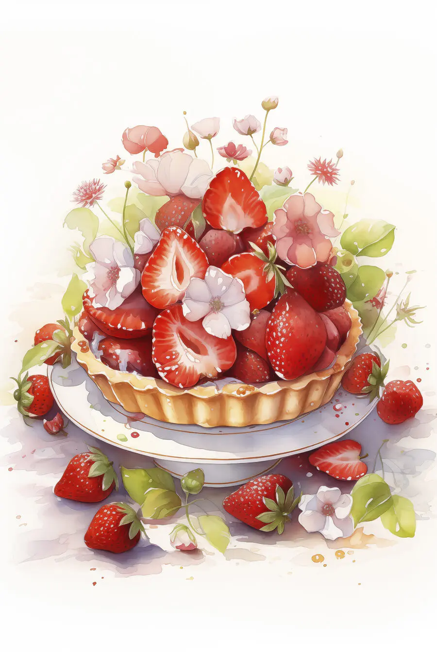 Obraz Akvarel koláče s jahodami a květinami