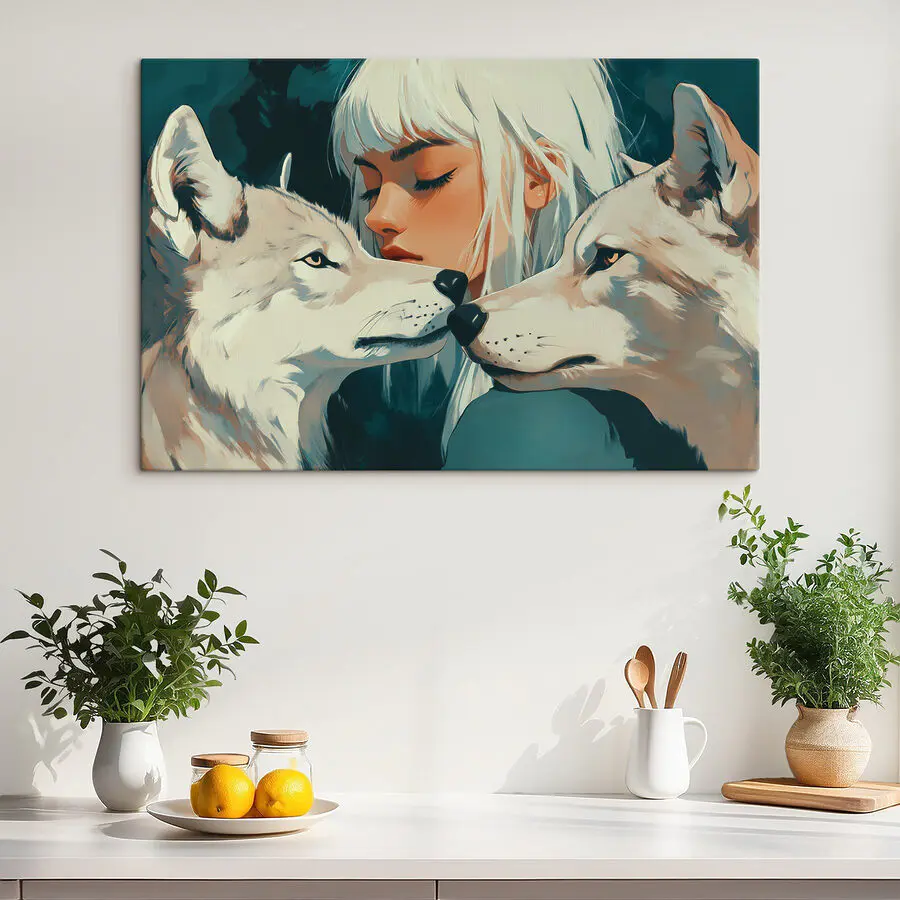 Vneste do svého prostoru nádech mystiky s tímto úžasným potiskem na plátně. Je na něm vyobrazena klidná žena s nápadně bílými vlasy, která se krčí mezi dvěma majestátními vlky, a je to jako mít kus přírody přímo na zdi. Syté barvy a emocionální hloubka díla připomínají tiché chvíle v lese, kde vládne věrnost a láska. Představte si, jak tento kus může podnítit rozhovory s přáteli nebo dokonce sloužit jako uklidňující kulisa při příjemném čtení. Není to jen dekorace - je to příběh, výzva k přijetí divokosti i něhy ve vašem domově. Je ideální pro ty, kdo oceňují jedinečné dekorace, a jemně nám připomíná krásu ve spojení jak se sebou samými, tak s nezkrotným světem.