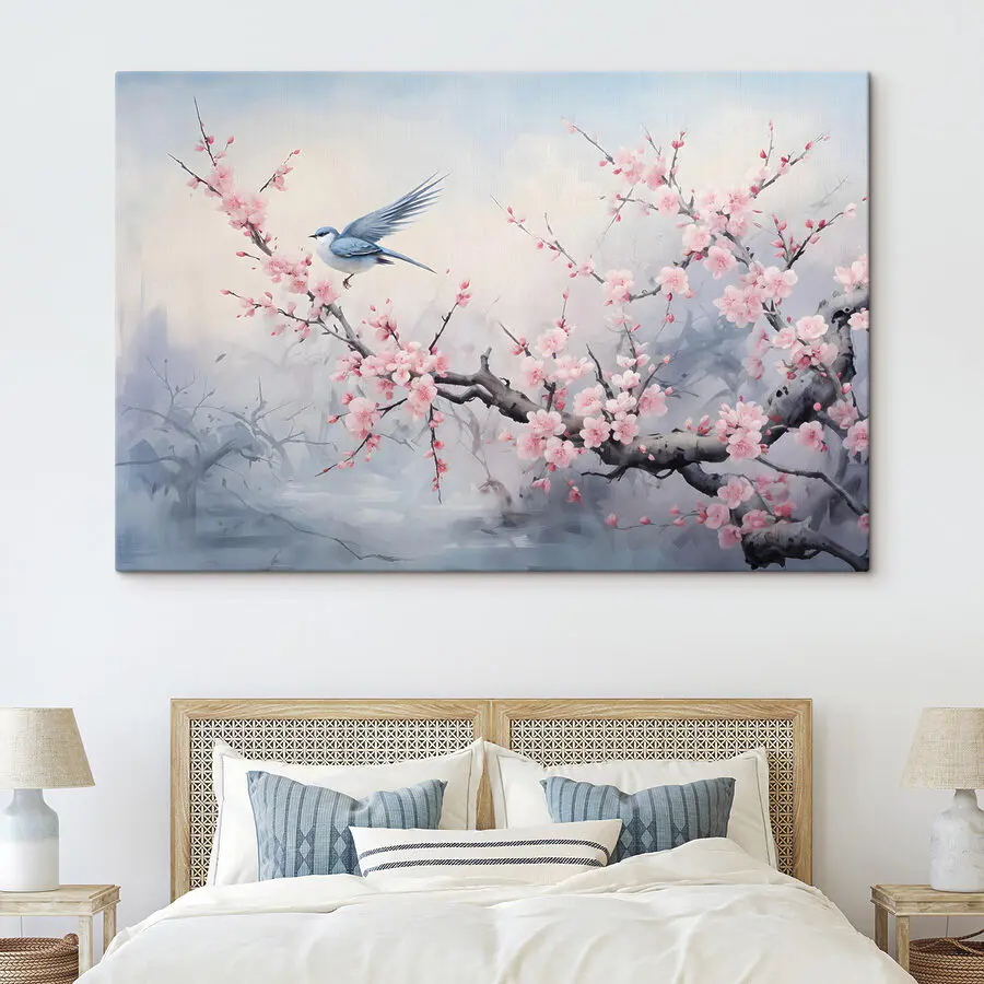 Obraz Pták na větvi s růžovými květy