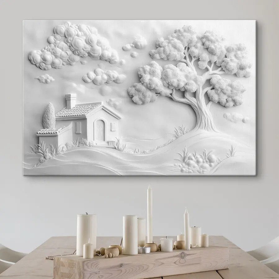 Proměňte jakoukoli stěnu v útulné útočiště pomocí tohoto okouzlujícího plátna s malebným domkem a nádherným stromem. Jako byste si přinesli kousek klidné přírody přímo do svého obytného prostoru. Představte si, že se probudíte a podíváte se na toto umělecké dílo - má tu klidnou atmosféru, která po dlouhém dni našeptává "relax". Měkké linie a jemné křivky vytvářejí uklidňující atmosféru a vybízejí ke snění o pikniku pod tímto stromem nebo o šálku teplého čaje na verandě. Skvěle se hodí do každé místnosti a bez námahy jí dodá nádech tepla a rozmarnosti, stejně jako pocit oblíbené vzpomínky na dětství. Kdo by nechtěl mít kousek takového?