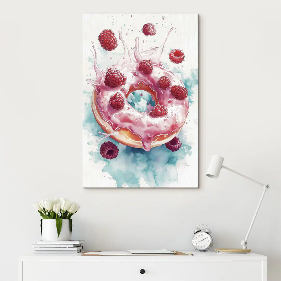 Obraz Malba koblihy s malinami a stříkajícím mlékem