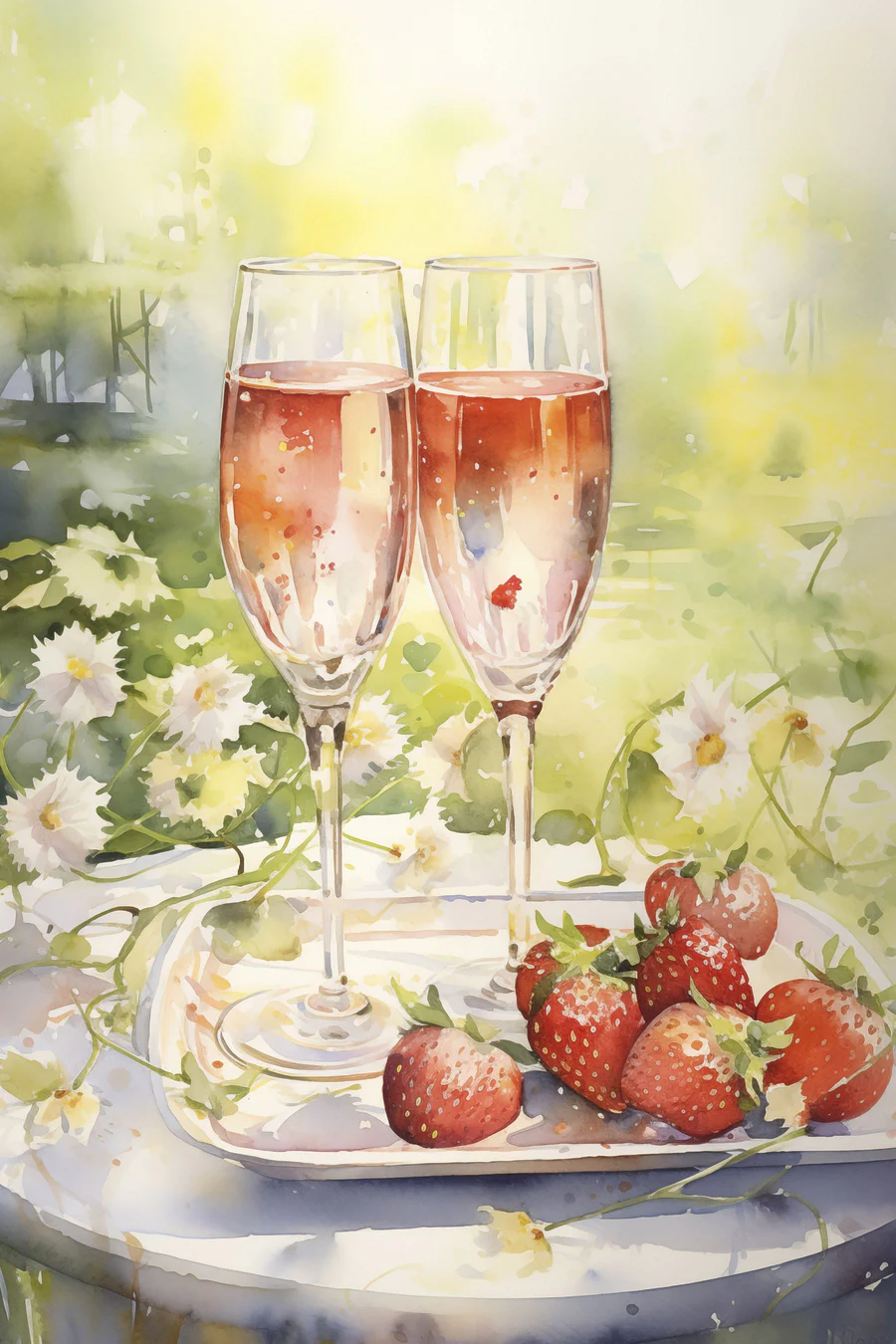 Obraz Akvarelová malba dvou sklenic šampaňského a jahod na podnose