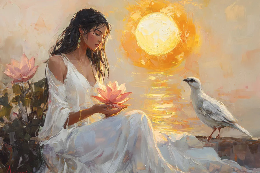 S tímto okouzlujícím potiskem na plátně se ponoříte do chvíle klidu. Představte si klidnou ženu, která drží v náručí krásnou květinu, zatímco se na ni dívá zvědavý pták, a to vše v jemné záři západu slunce. Jako by sdílela tajemství s přírodou a pozvala klid do každé místnosti. Toto umělecké dílo, které se skvěle hodí do útulného obývacího pokoje nebo klidného zákoutí, dokáže proměnit jeho atmosféru a učinit ji hřejivou a přívětivou. Představte si, jak poblíž popíjíte čaj, jste ztraceni v myšlenkách nebo sníte - tento kousek skutečně dodává nádech klidu. Rozkošný doplněk na každou stěnu, který vyvolává úsměvy a jemné odrazy.