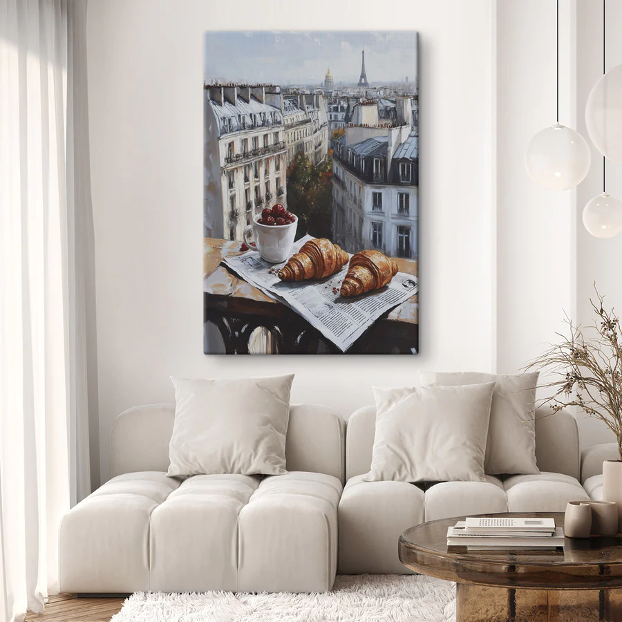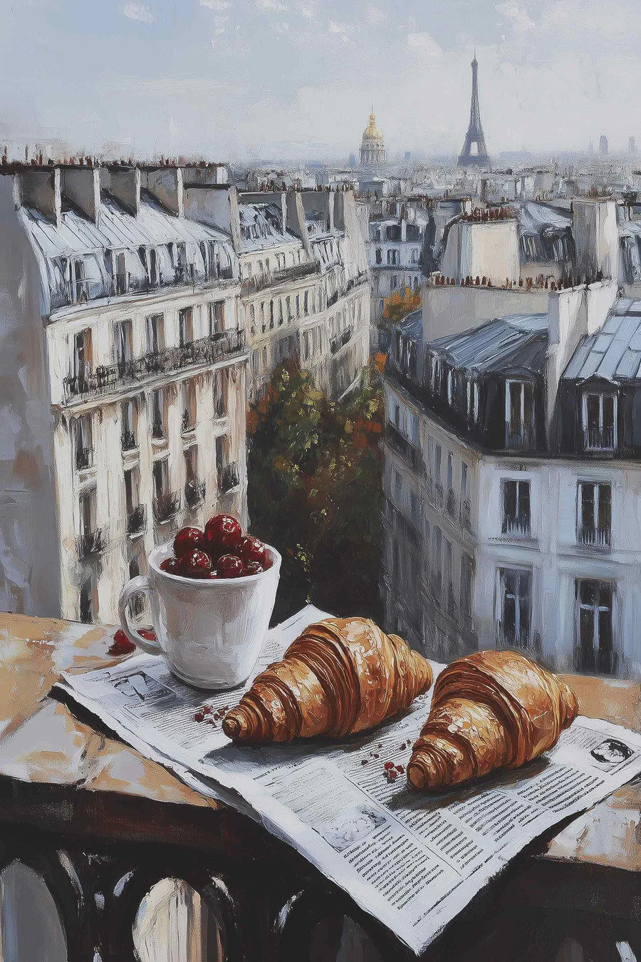 Obraz Šálek kávy a croissanty na stole s budovami v pozadí